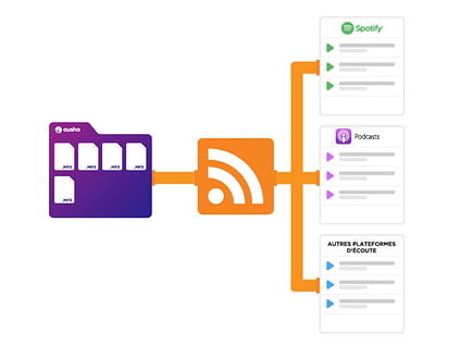 By using a hosting platform dedicated to podcasts, they can generate an RSS feed for your podcast for you. This feed will be materialized as an .rss address which you’ll be able to share on any of the platforms on which you wish to be present. It is also possible to customize this feed in order to decide on its content (present episodes, description, cover etc.). For example, each time you add a file to your host, the feed will automatically be updated. Here’s an illustration of how an RSS feed works when adding an episode to your web host: