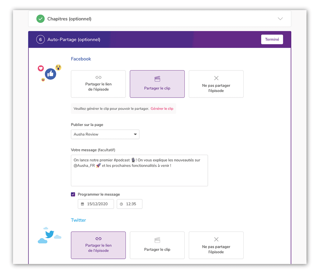 Avec l’Autopartage, vous pouviez déjà publier sur Facebook et Twitter dès que votre épisode est disponible sur Ausha. Mais le partage automatique ne prend pas en compte le petit temps de latence entre sa publication sur Ausha et sa publication sur les plateformes d’écoute. Entre Deezer et Apple Podcast, par exemple, il y a souvent quelques heures de différence.