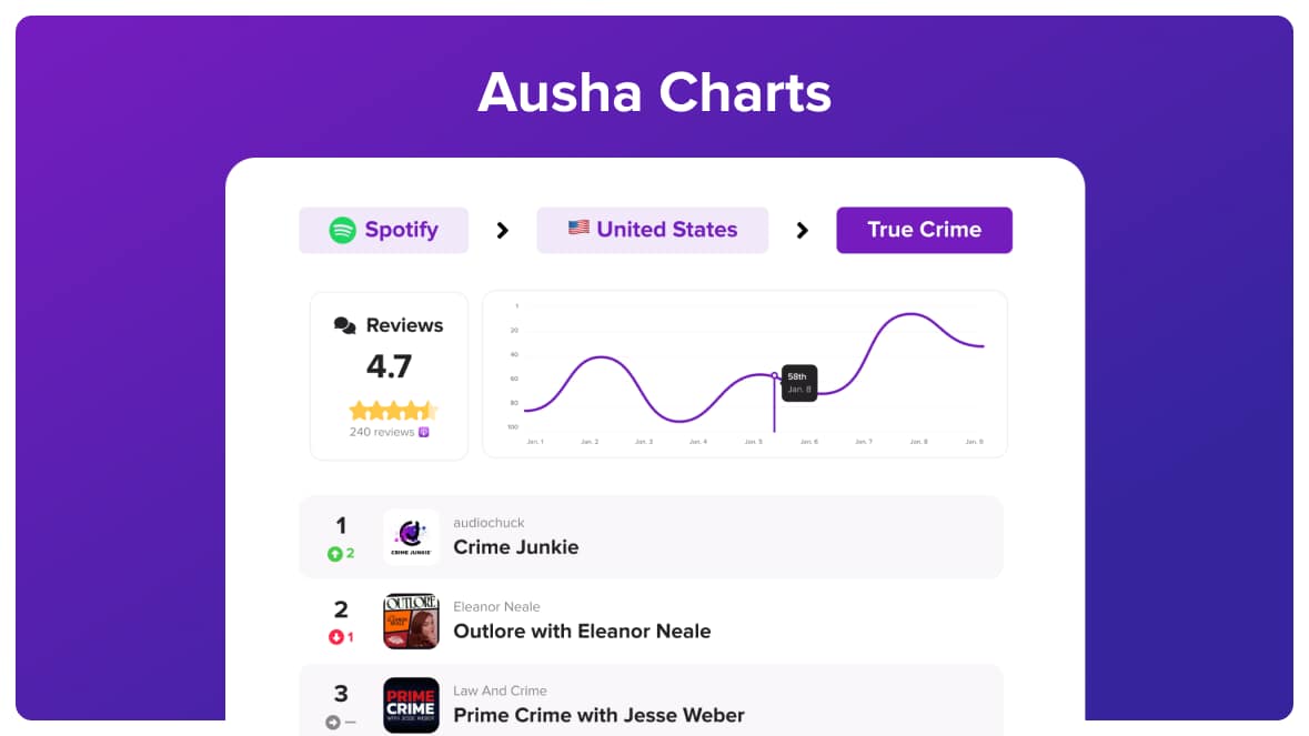 Avec Ausha Charts, vous avez enfin une vision claire et gratuite de votre visibilité sur Apple Podcasts et Spotify. Plus besoin de naviguer à l’aveugle : vous savez où vous vous situez, comment évoluent vos classements, et face à qui vous vous mesurez.
