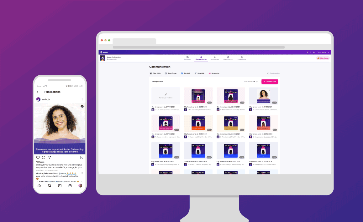 Le nouveau Module Communication d’Ausha rassemble tous vos outils de communication pour faire décoller votre podcast au même endroit. Au sein du même onglet, retrouvez :