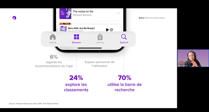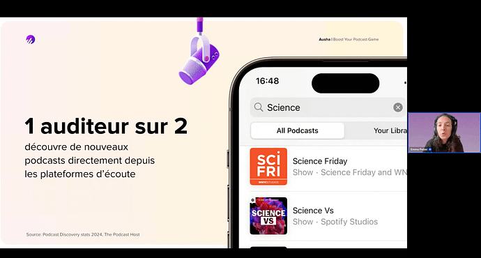 Des milliers d’émissions se battent pour la même audience, mais vous avez le pouvoir de booster votre visibilité et d'attirer plus d'auditeurs que vos concurrents ! Comment ? En combinant la puissance des Charts et du Podcast Search Optimization (PSO). Animé par Emma Potier, Head of Brand Content chez Ausha et hôte du podcast Tips, cette session vous donnera les outils et les clés pour transformer votre visibilité en véritable croissance pour votre podcast.