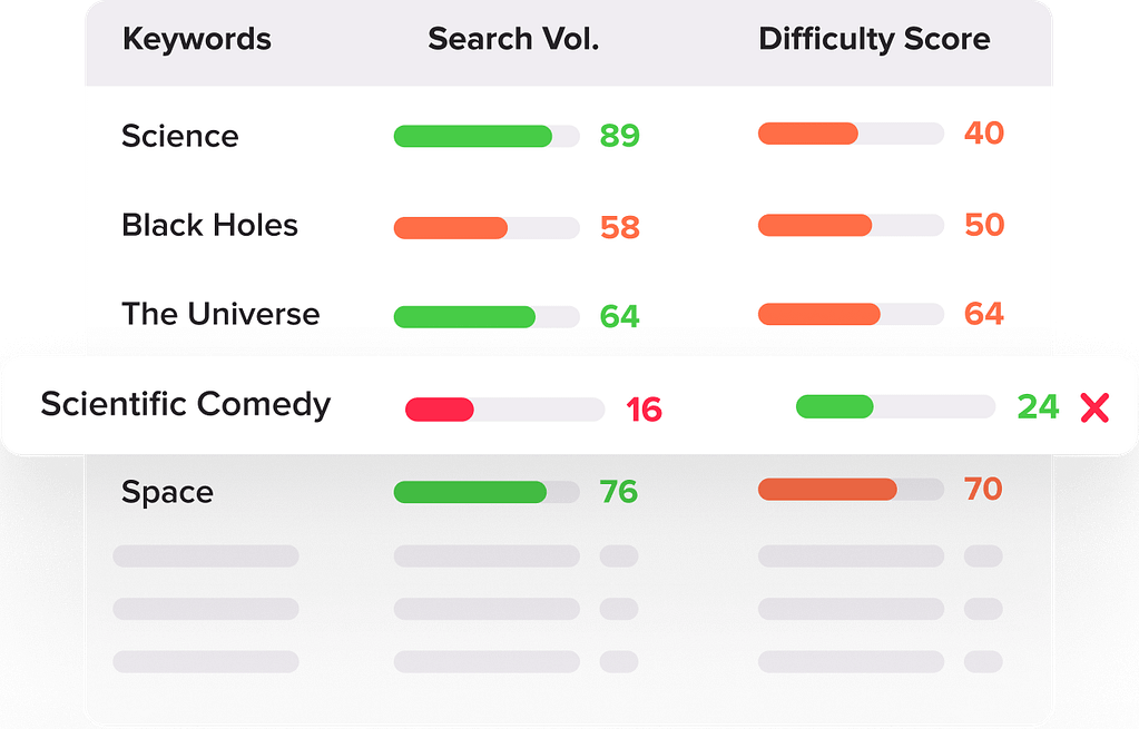 See which keywords people search for most with Search Volume, and how competitive they are with the Difficulty Score.
