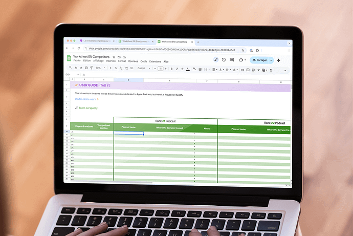 That’s exactly what this worksheet delivers. It guides you step by step to map your direct competitors and analyze their keyword strategies. The “Main Competitors List” tab gives you an overview of the shows that share your audience and topics. With this high-level view, you can spot the most active and popular podcasts, but also those that manage to rank well despite weaker descriptions or average ratings.